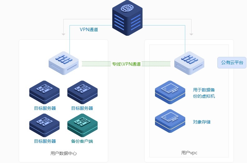 專線連通后,在用戶數(shù)據(jù)中心部署數(shù)據(jù)備份客戶端,將您本地的照片、音頻、視頻、數(shù)據(jù)庫文件同步備份 到云端的對(duì)象存儲(chǔ)或虛擬機(jī)上