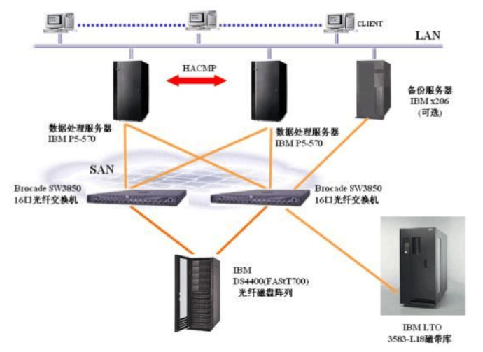 2臺IBMUNIX服務(wù)器P570,作為系統(tǒng)的主服務(wù)器;一臺運(yùn)行oracle數(shù)據(jù)庫管理系統(tǒng),提供主數(shù)據(jù)庫服務(wù);另外一臺運(yùn)行Weblogic應(yīng)用服務(wù)器軟件,作為系統(tǒng)應(yīng)用服務(wù)器;并且兩臺主服務(wù)器采用IBMHACMP的雙機(jī)熱備軟件,實現(xiàn)雙機(jī)熱備系統(tǒng)。