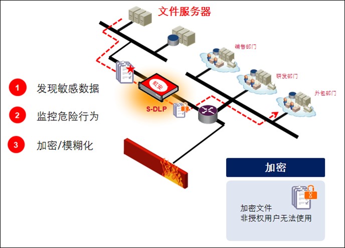 S-DLPForFileServers系統(tǒng)對文件服務(wù)器中的敏感數(shù)據(jù)進(jìn)行內(nèi)容識別、危險監(jiān)控與安全防護(hù)(阻斷、提醒、告警、加密等),實(shí)現(xiàn)文件服務(wù)器中敏感數(shù)據(jù)泄露、擴(kuò)散防護(hù);