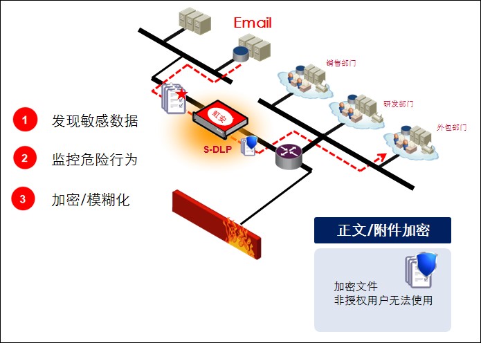 S-DLPForEmail系統(tǒng)對郵件中的敏感數(shù)據(jù)進(jìn)行內(nèi)容識別、威脅監(jiān)控與安全防護(hù)(阻斷、提醒、告警、加密等),實(shí)現(xiàn)郵件中敏感數(shù)據(jù)泄露防護(hù);