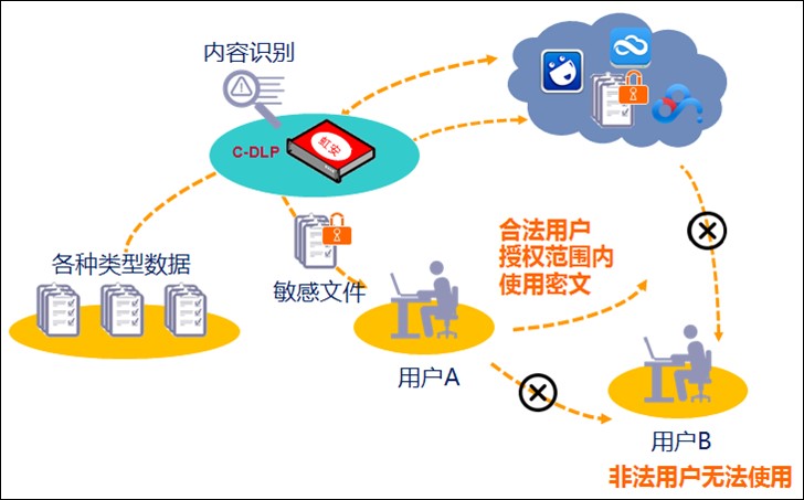 C-DLP系統(tǒng)對云端敏感數(shù)據(jù)進(jìn)行內(nèi)容識別、危險行為監(jiān)控與安全防護(hù)(阻斷、提醒、告警、加密...),在不影響使用的前提下,實(shí)現(xiàn)云端敏感數(shù)據(jù)泄露、擴(kuò)散防護(hù);