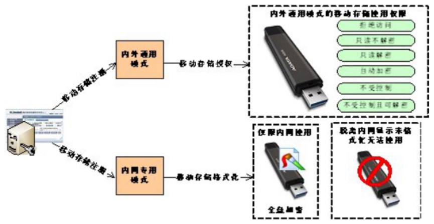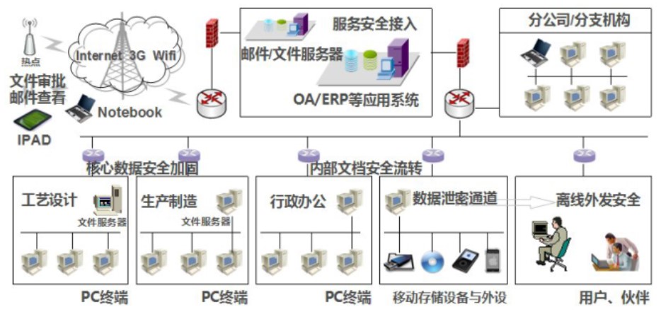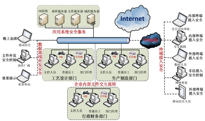 但是由于業(yè)務(wù)上的需要,企業(yè)需要開放移動存儲設(shè)備、計(jì)算機(jī)外設(shè)和網(wǎng)絡(luò)的資源,企業(yè)部署的傳統(tǒng)網(wǎng)絡(luò)或者系統(tǒng)安全設(shè)備和系統(tǒng)已經(jīng)不能夠很好好適應(yīng)信息安全形勢的新變化。首先,為企業(yè)用戶提供正常辦公及處理內(nèi)部業(yè)務(wù)使得文檔交流傳輸過程難以安全可控,文檔脫離內(nèi)部管理平臺容易造成文件的擴(kuò)散和外泄。其次,內(nèi)部終端用戶的文檔操作行為管理也不規(guī)范。最后,企業(yè)內(nèi)部移動存儲設(shè)備可以隨意在任意物理終端計(jì)算機(jī)上使用,容易感染病毒和泄密;移動存儲介質(zhì)丟失后,極易導(dǎo)致敏感數(shù)據(jù)泄密。