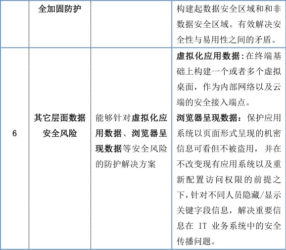 三昶公司針對企業(yè)數(shù)據(jù)保護(hù)類型的重要程度,提出以數(shù)據(jù)特點(diǎn)為設(shè)計(jì)原則,以安全風(fēng)險為驅(qū)動,以模塊化設(shè)計(jì)為思想,以服務(wù)客戶為目標(biāo)的整體安全解決方案。詳細(xì)分析客戶的管理模式和業(yè)務(wù)流程,評估存在的數(shù)據(jù)泄漏風(fēng)險,并在客戶現(xiàn)有業(yè)務(wù)系統(tǒng)基礎(chǔ)之上,提供針對性的安全解決方案,幫助企業(yè)用戶改進(jìn)和規(guī)范客戶的數(shù)據(jù)風(fēng)險管理體系。如下表圖所示。